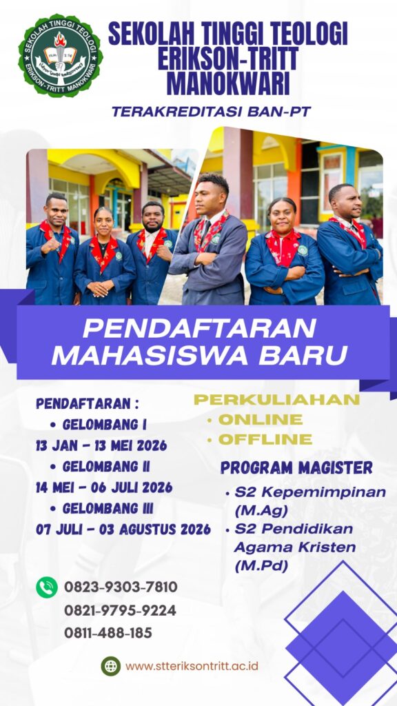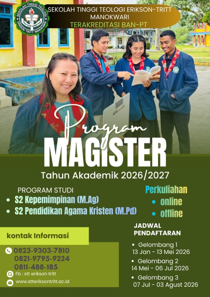 Sekolah Tinggi Teologi (STT) Erikson-Tritt Manokwari kembali membuka pendaftaran Mahasiswa Baru untuk Program Magister (S2) Tahun Akademik 2026/2027. Sebagai kampus yang telah resmi Terakreditasi BAN-PT, kami berkomitmen untuk memperlengkapi Anda menjadi pemimpin dan pendidik Kristen yang transformatif dan berdampak luas.